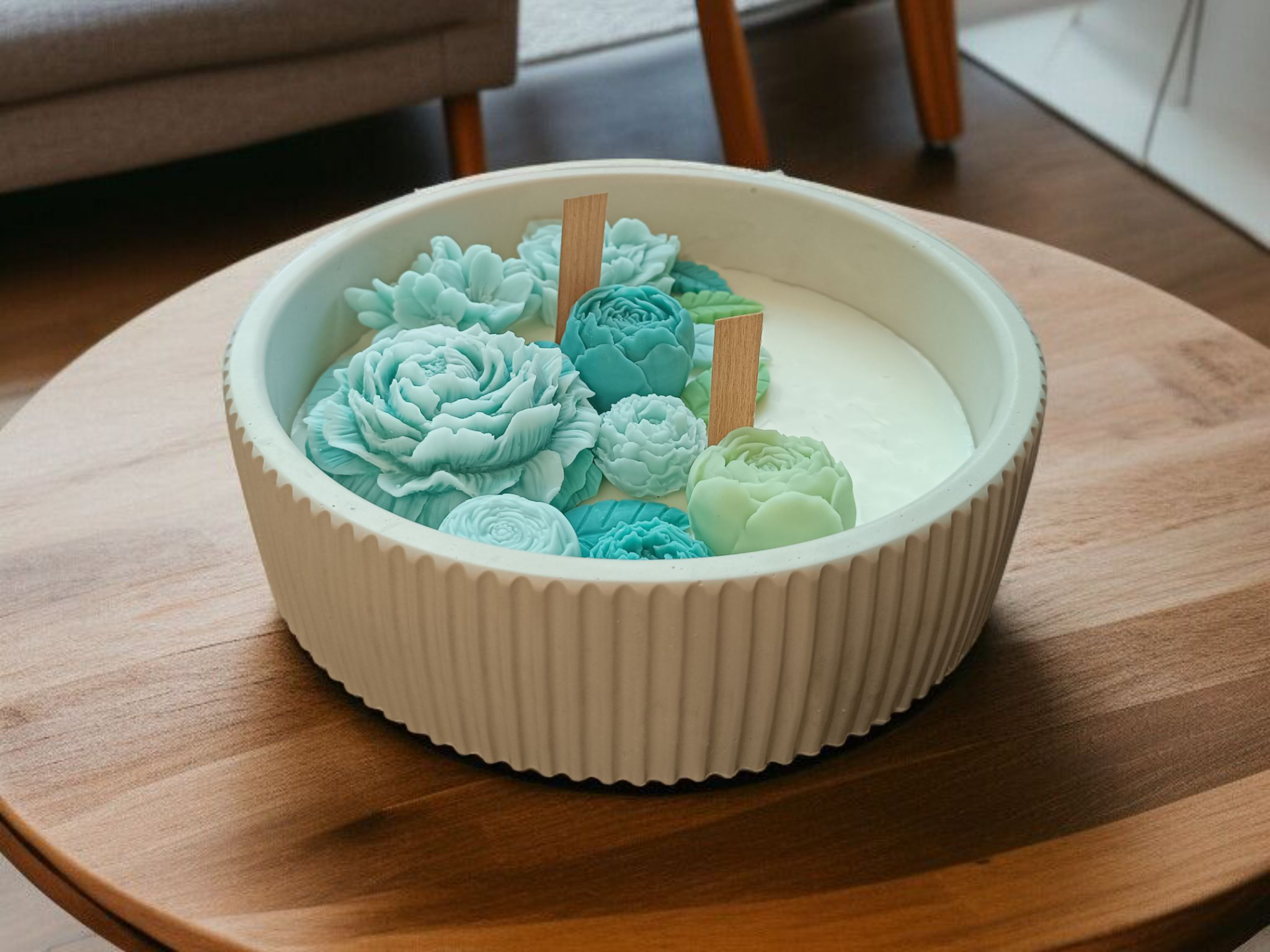 Ez az egyedi, kézzel öntött szójaviasz gyertya stílusos kerámia tálban érkezik, és azonnal a tér fókuszpontjává válik. A tetején finoman mintázott, vízkék és mentazöld árnyalatú viaszvirágok díszítik, így egyszerre illatforrás és dekoráció. A két fa kanóc hangulatos, ropogó égést ad, ami még meghittebbé teszi a használatát.